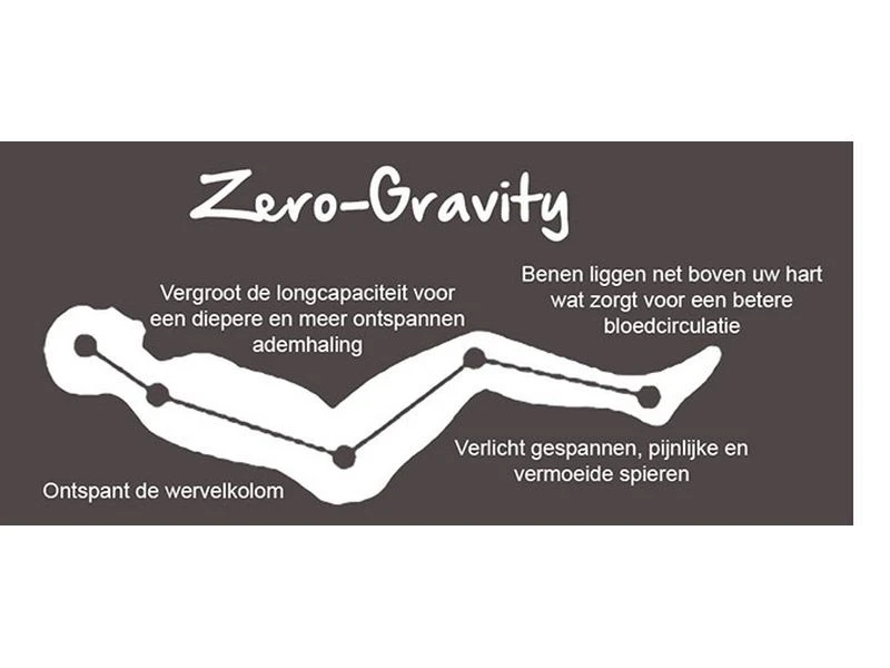 Zero gravity relaxstoelen LafumaDe zero gravity stand is een stand met een hoek van 127 graden waarbij de benen hoger liggen dan het hart. Dit heeft verschillende voordelen. Doordat de benen en voeten hoger liggen dan het hart, wordt de bloedsomloop bevorderd.